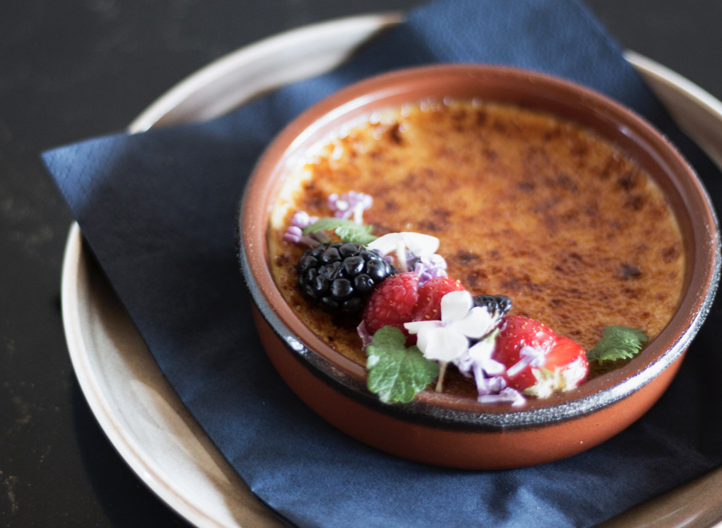Hjemmelagd creme brulee med spø og god karamelisert topp. serveres med ferske bær. En klassiker.