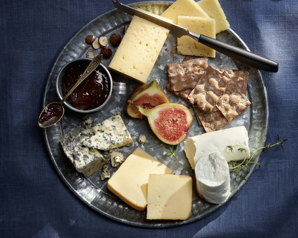 Et ostefat med kjeks og blandt annet brie, camembert, blåmuggost og en vellagret Jarlsberg. I tilleg serveres kokkens anbefallingav syltetøy.