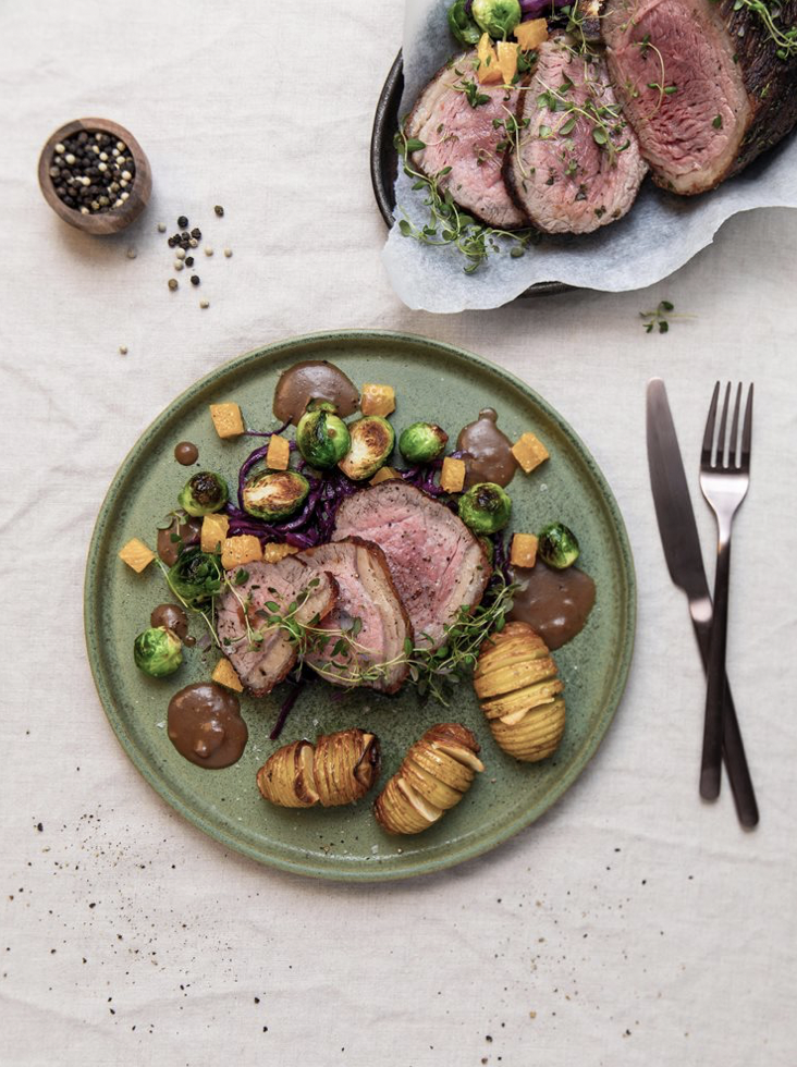 Timiankrydret okseculotte med hasselbackpoteter, smørglasert kål med apperlin og soppsaus. Smaksrik og mørt kjøtt.