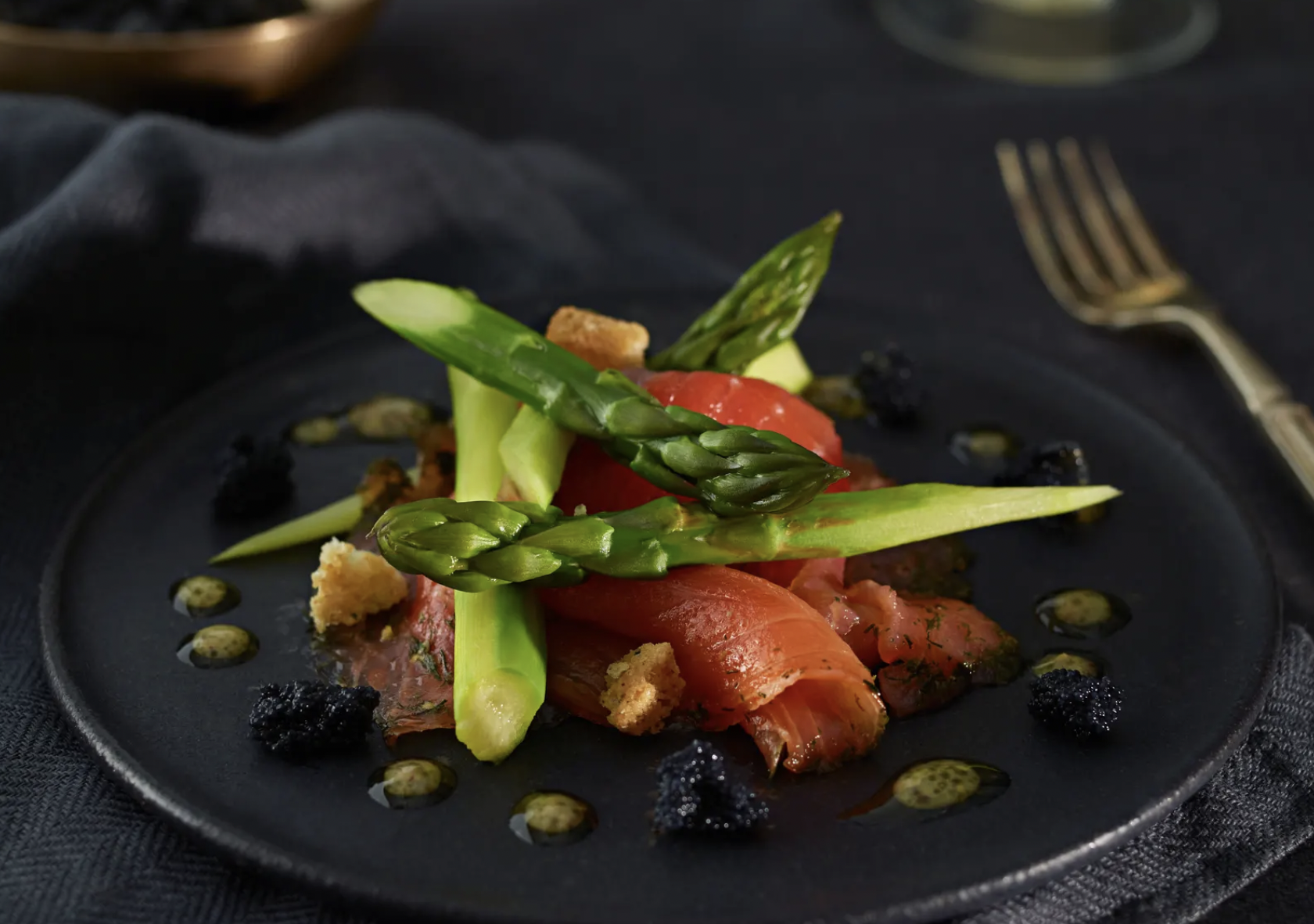 Asparges med gravlaks serveres med lodderogn og krutonger.