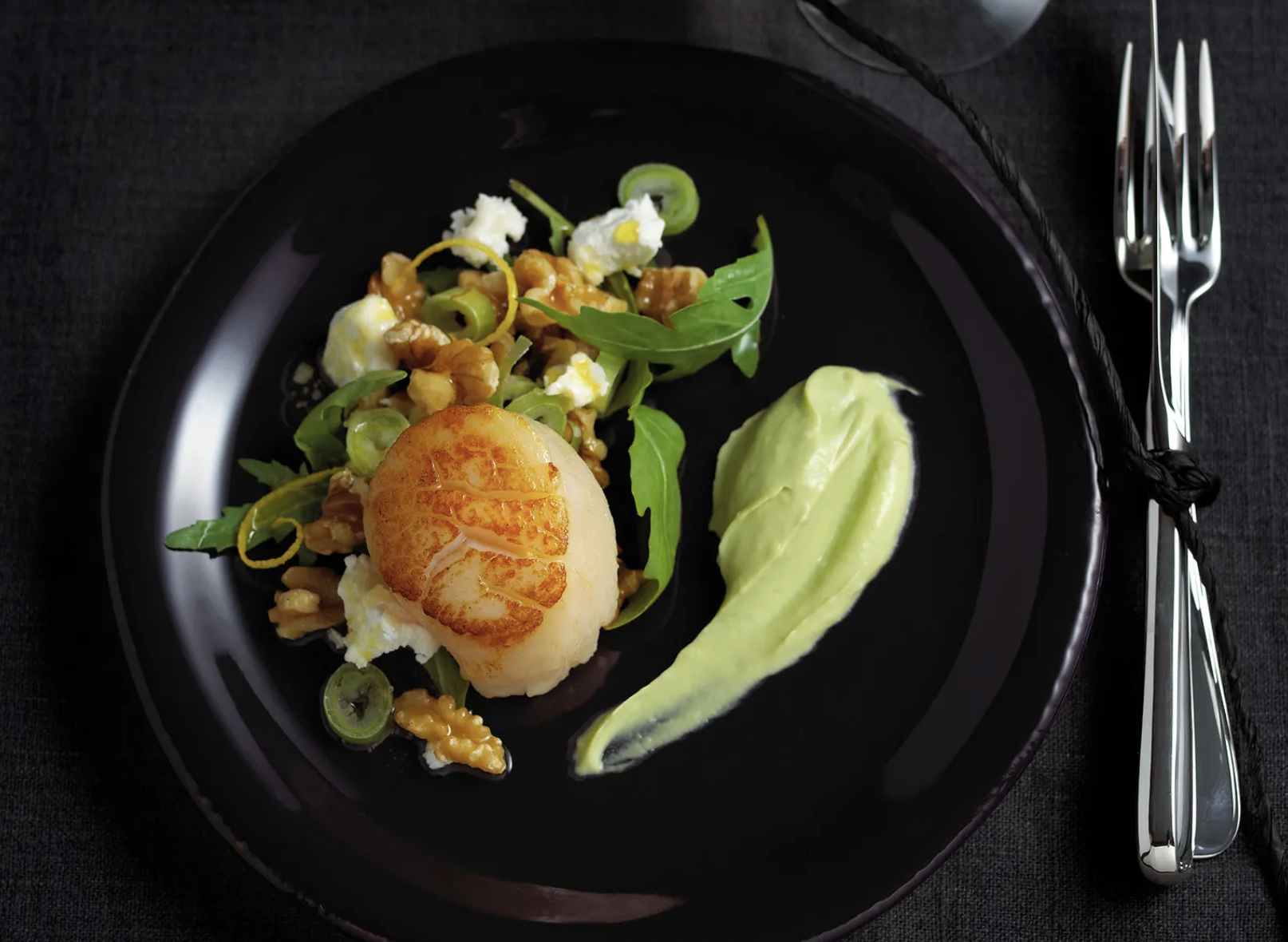 Stekte kamskjell med avokadokrem, sitronsmør og chevre- og valnøttsalat