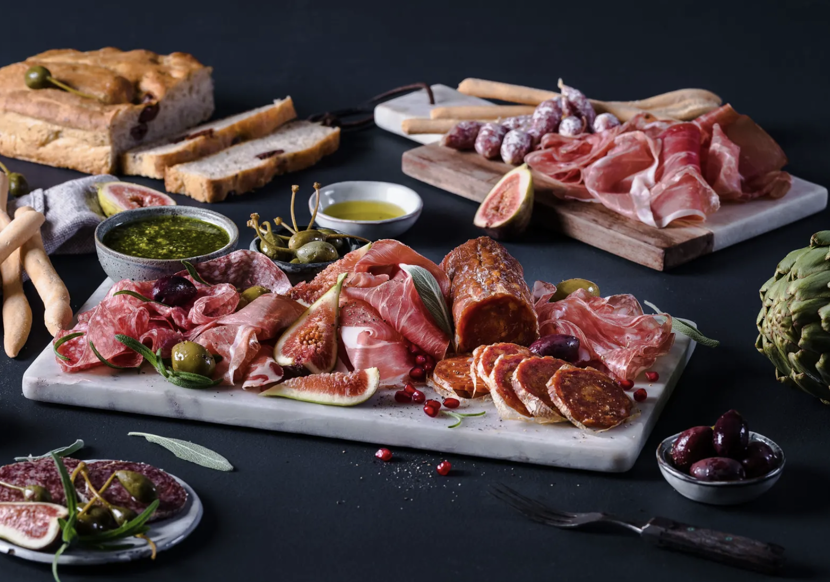 Et spennende utvalg av spekemat. Det serveres et brett med salami, parmaskinke og spekepølse samt oliven og pesto for ekstra smak. Fin rett til å dele.