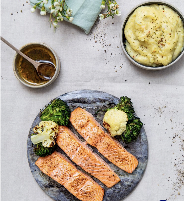 Laksefilet med ovnbakte grønnsaker. Serveres med smaksrik soyasaus og hjemmelaget potetmos.
