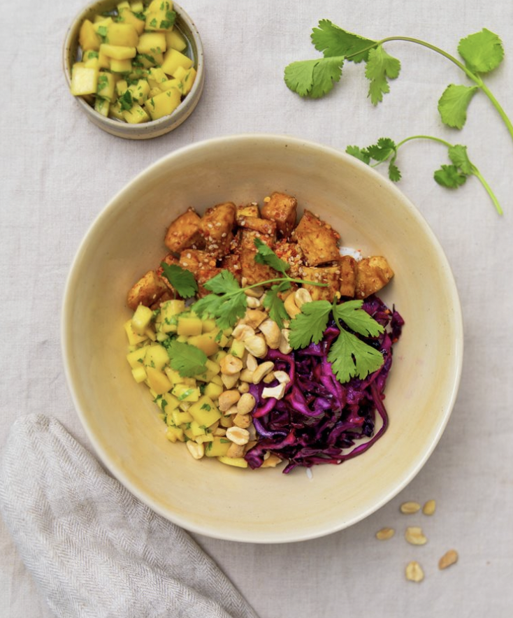 Poke bowl med ponzumarinert tofu, syrlig rødkål og mangosalsa